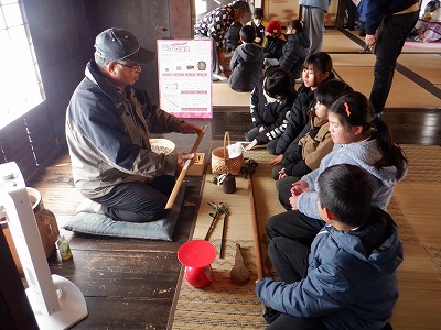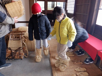 藁草履をはいたり、着物を着たり、石臼をひいたりと今の生活にはないものをたくさん見聞きし、大変興味深い体験ができました。一つひとつの生活用品を触り、楽しみながら昔の暮らしを想像することができたのではないでしょうか。